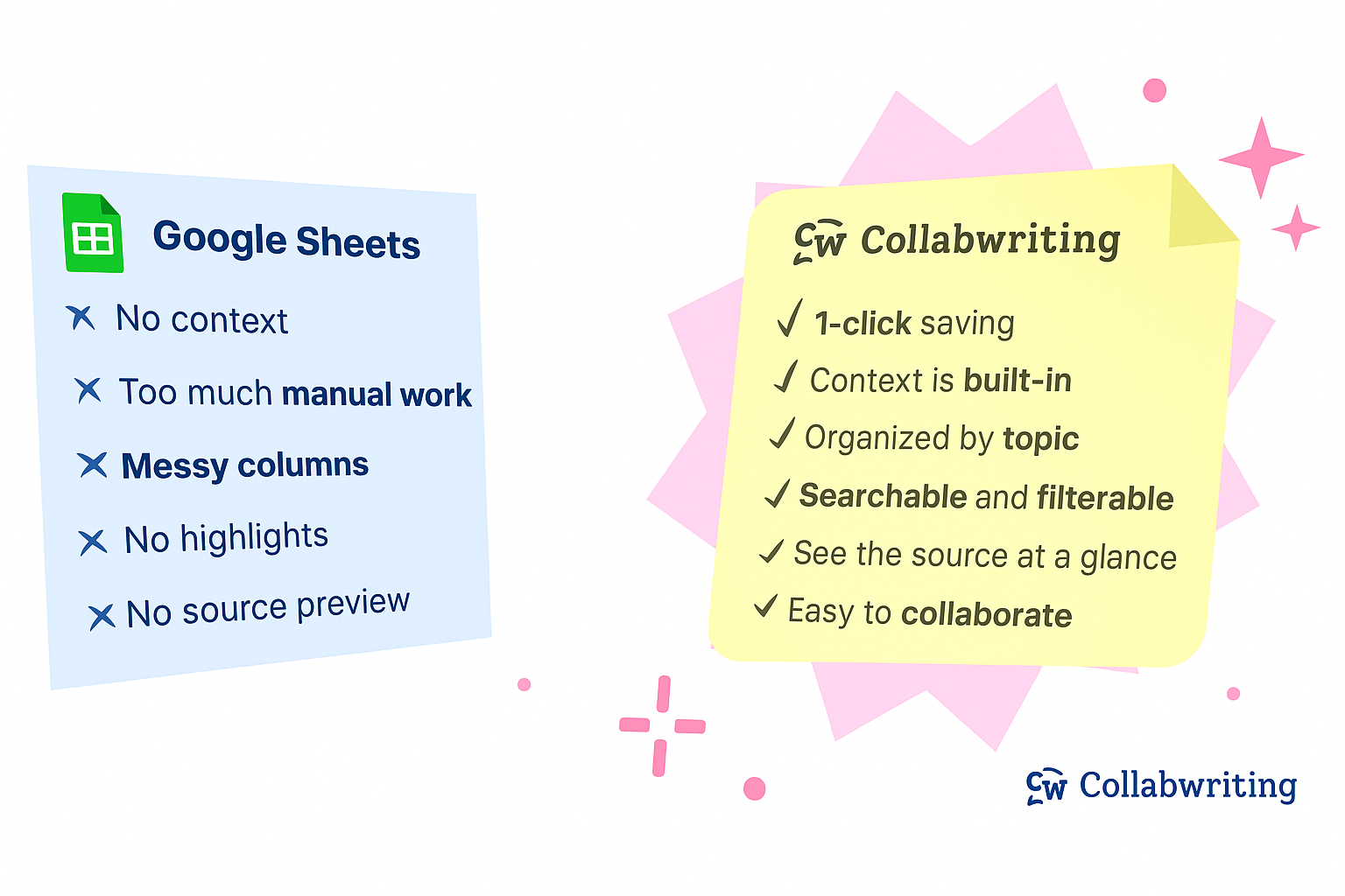 Spreadsheets work if you prioritize control and consistency, but they slow you down and strip away the context that makes research truly useful.