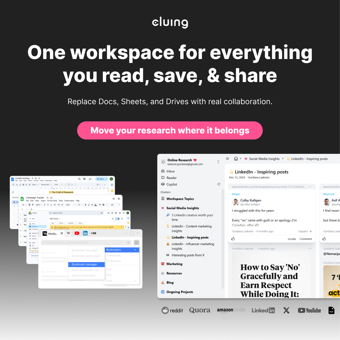 With Cluing, you can save research snippets with sources attached and collaborate directly on them. Editors see where ideas come from and can focus on improving your writing, not chasing links.