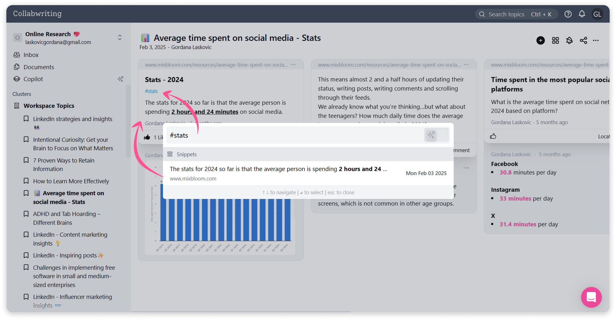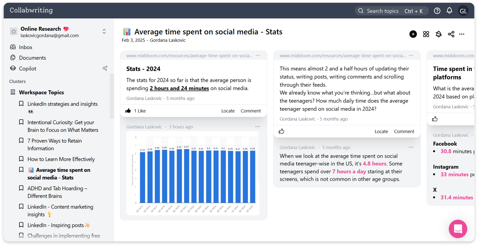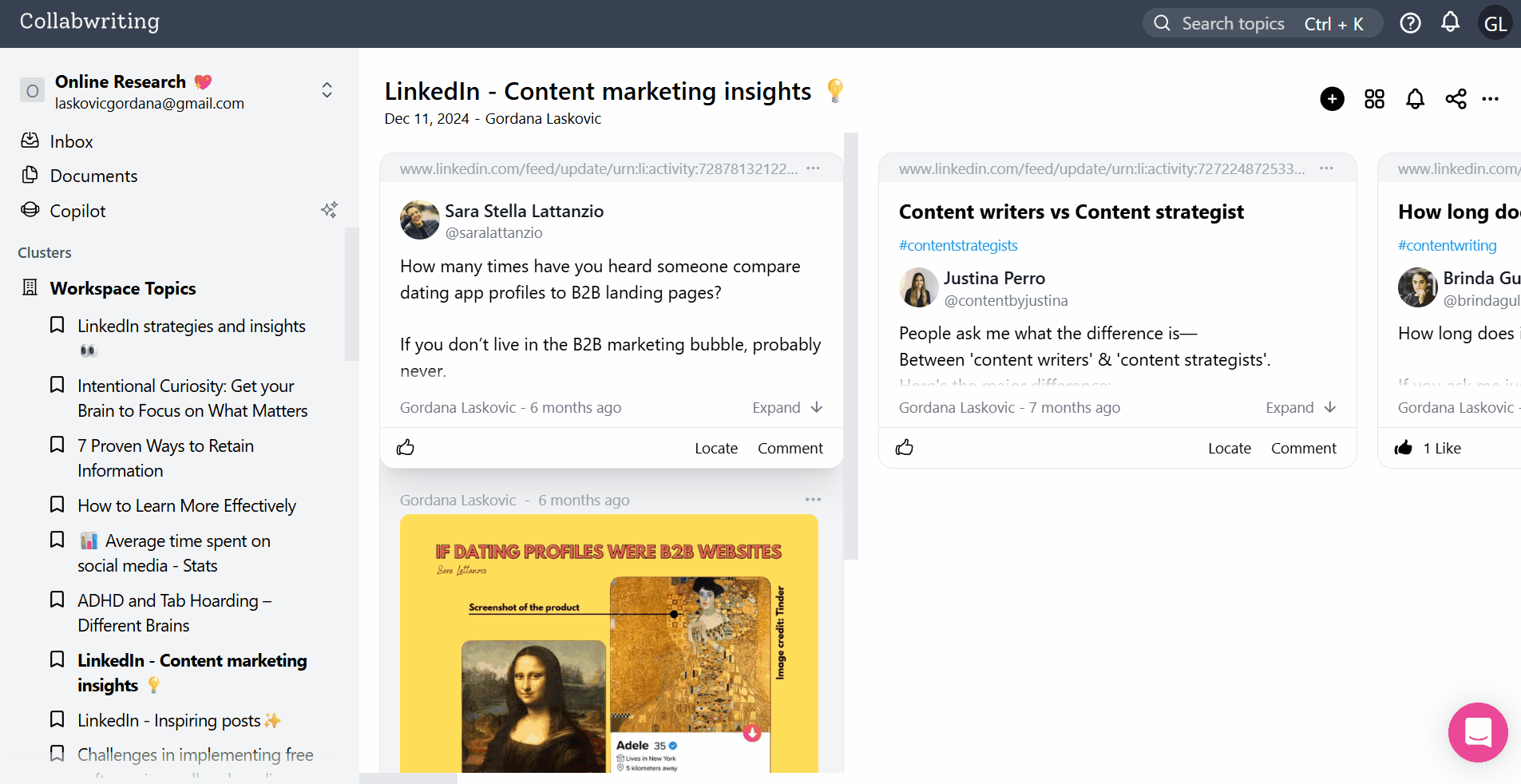 When I find an article, PDF, or social post, I use the Collabwriting browser extension. I highlight sentences or paragraphs that matter, and each highlight automatically saves the original source.