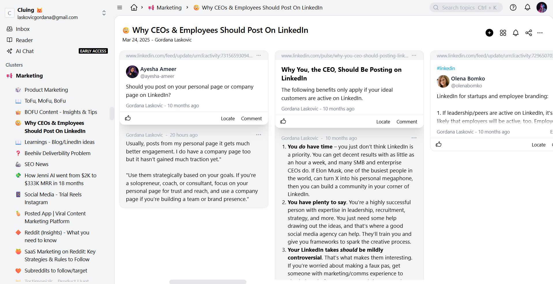 When I find an article, PDF, or social post, I use the Cluing browser extension. I highlight sentences or paragraphs that matter, and each highlight automatically saves the original source.