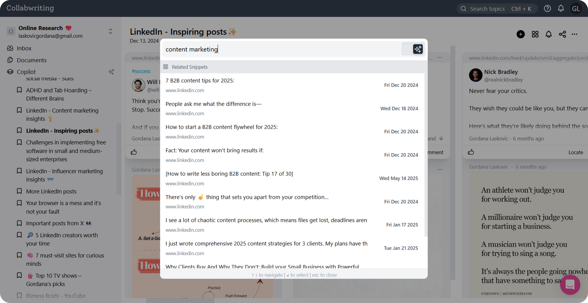 Instead of a chaotic collection of links, structure content into clusters like Competitor Analysis or SEO Trends, making everything easy to find and reference.