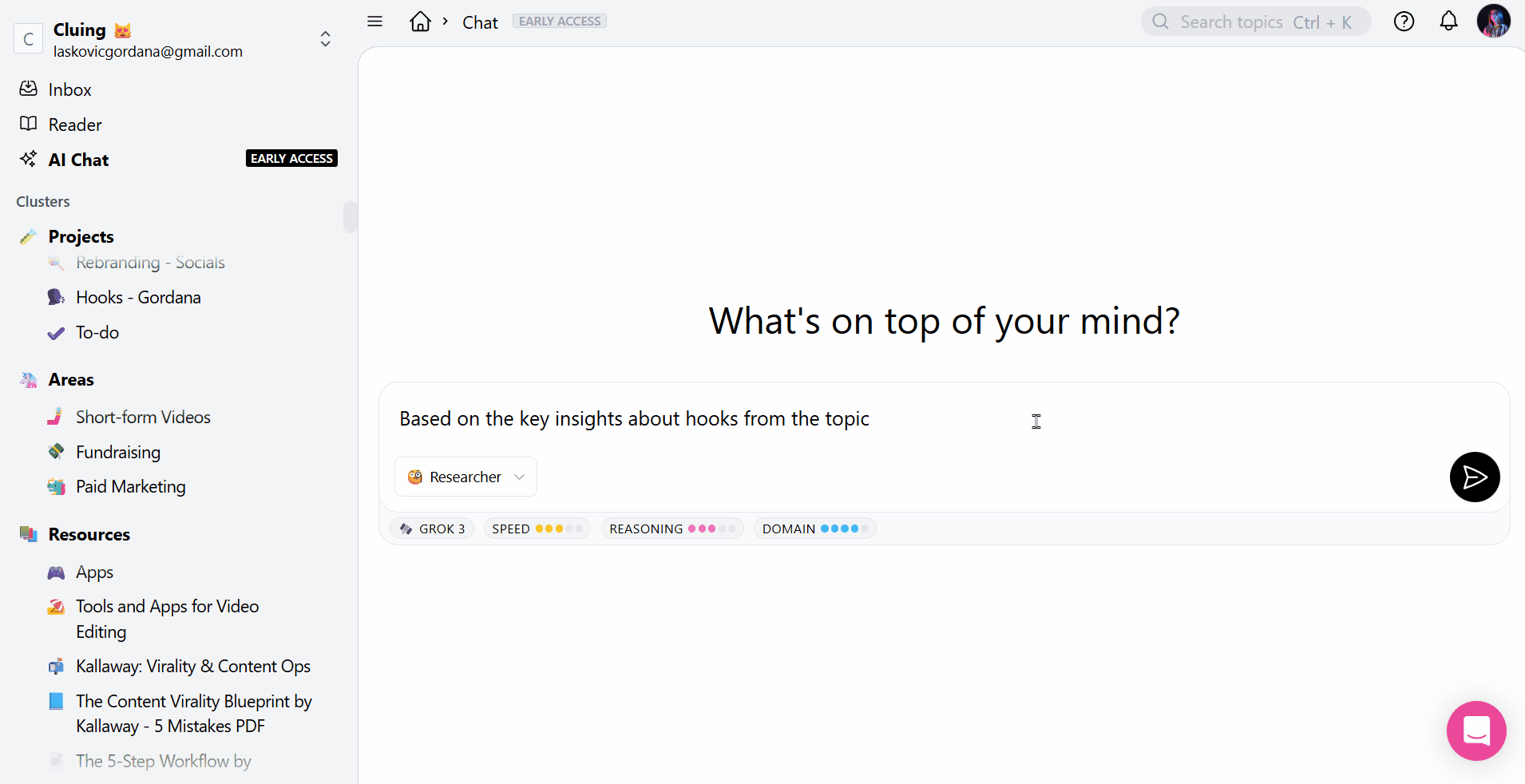 Cluing AI Chat uses your curated snippets to summarize ideas, create content outlines, compare insights, or generate scripts.
