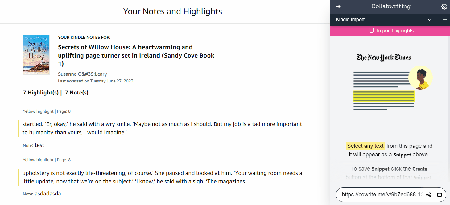 - Just open your Kindle notes, hit “Import Highlights,” and all your saved highlights will show up in the Topic you choose - ready to tag, comment, and organize.