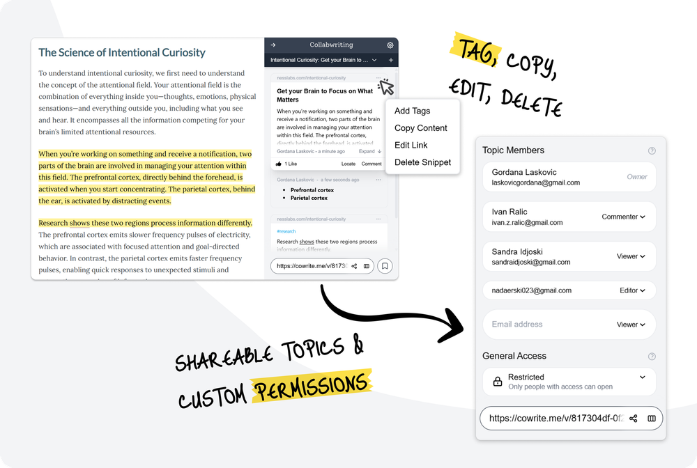 - Permissions for topics and clusters - Control who can view, edit, or comment on each topic or cluster, making team collaboration secure and organized.