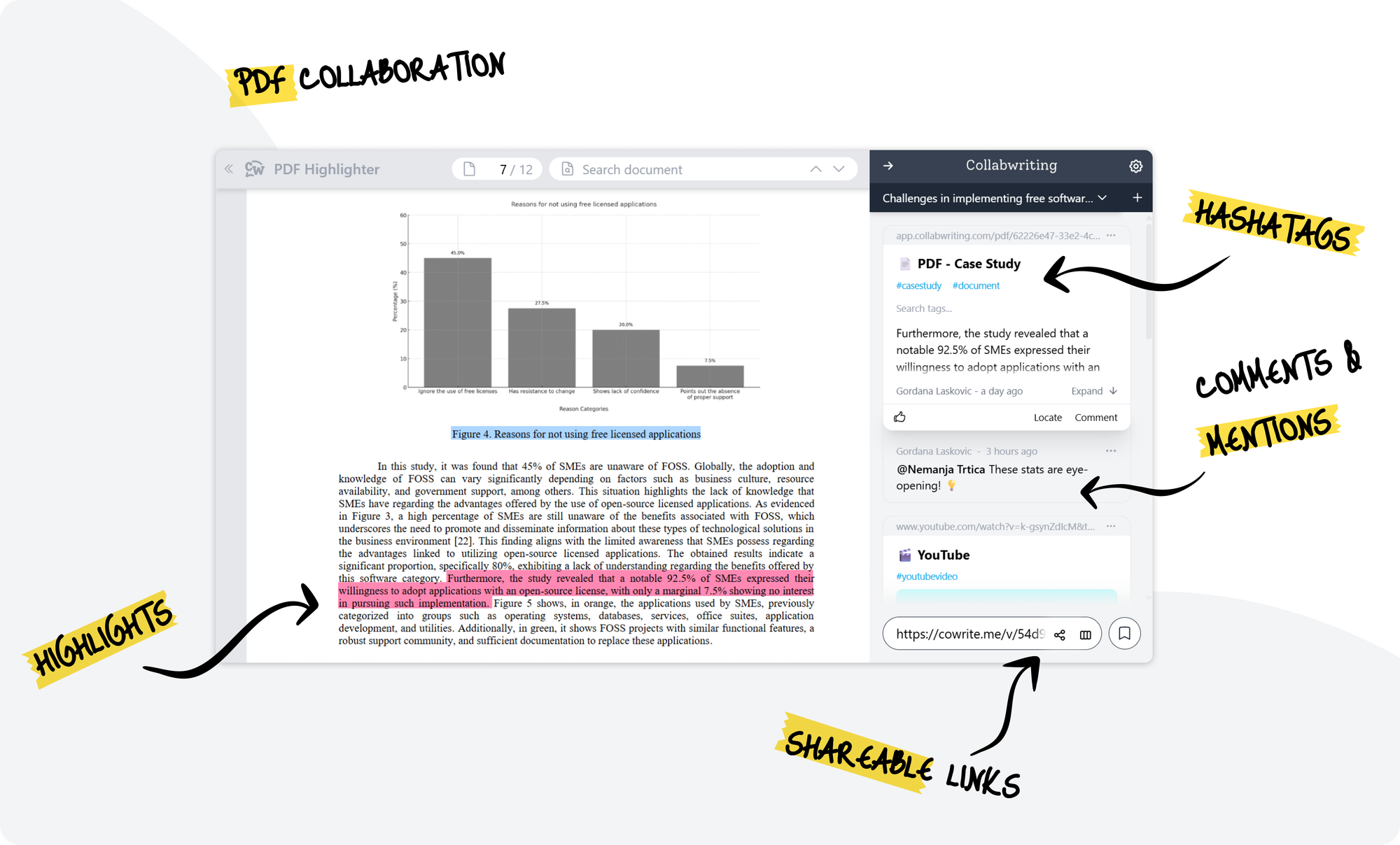 In a better system, collaboration is built in. You can leave a comment on a highlight, tag anyone, or organize shared research under one link so everyone sees the same thing, with full context.