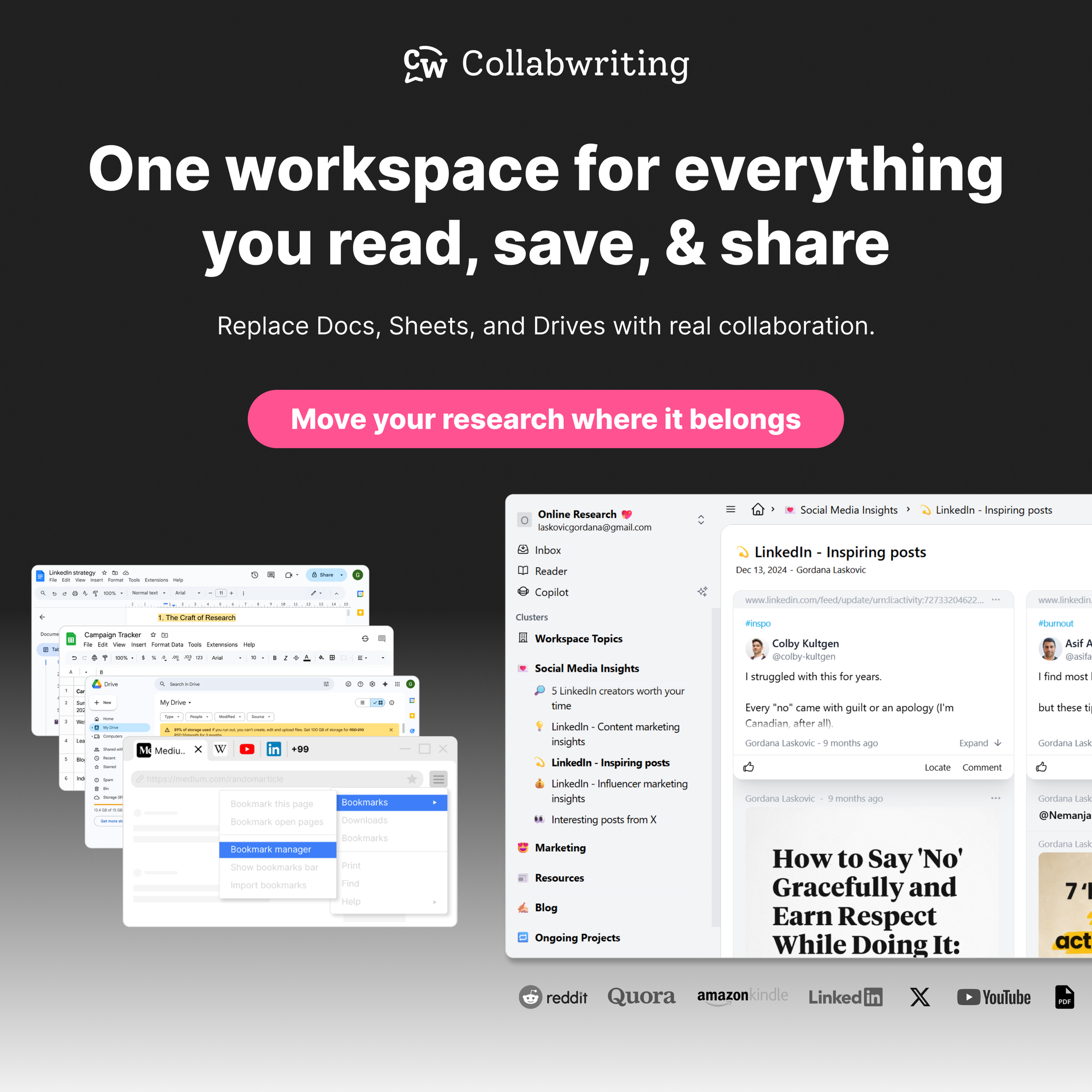 Collabwriting helps you connect all of it - highlights, PDFs, LinkedIn posts, YouTube timestamps, comments, context - into one organized, collaborative workflow that finally makes sense.