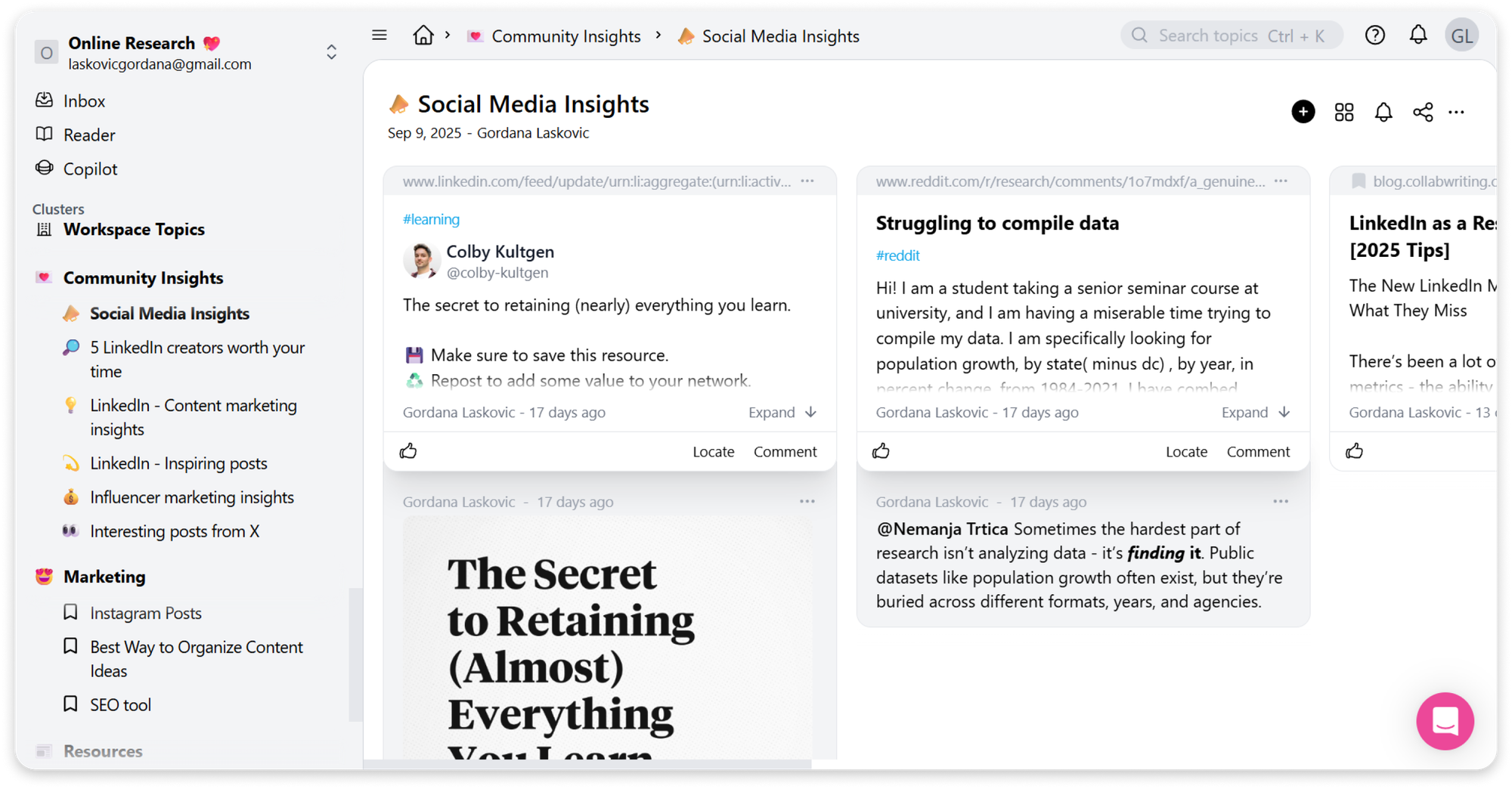- Organize research into clusters and topics so every saved item has a clear purpose.